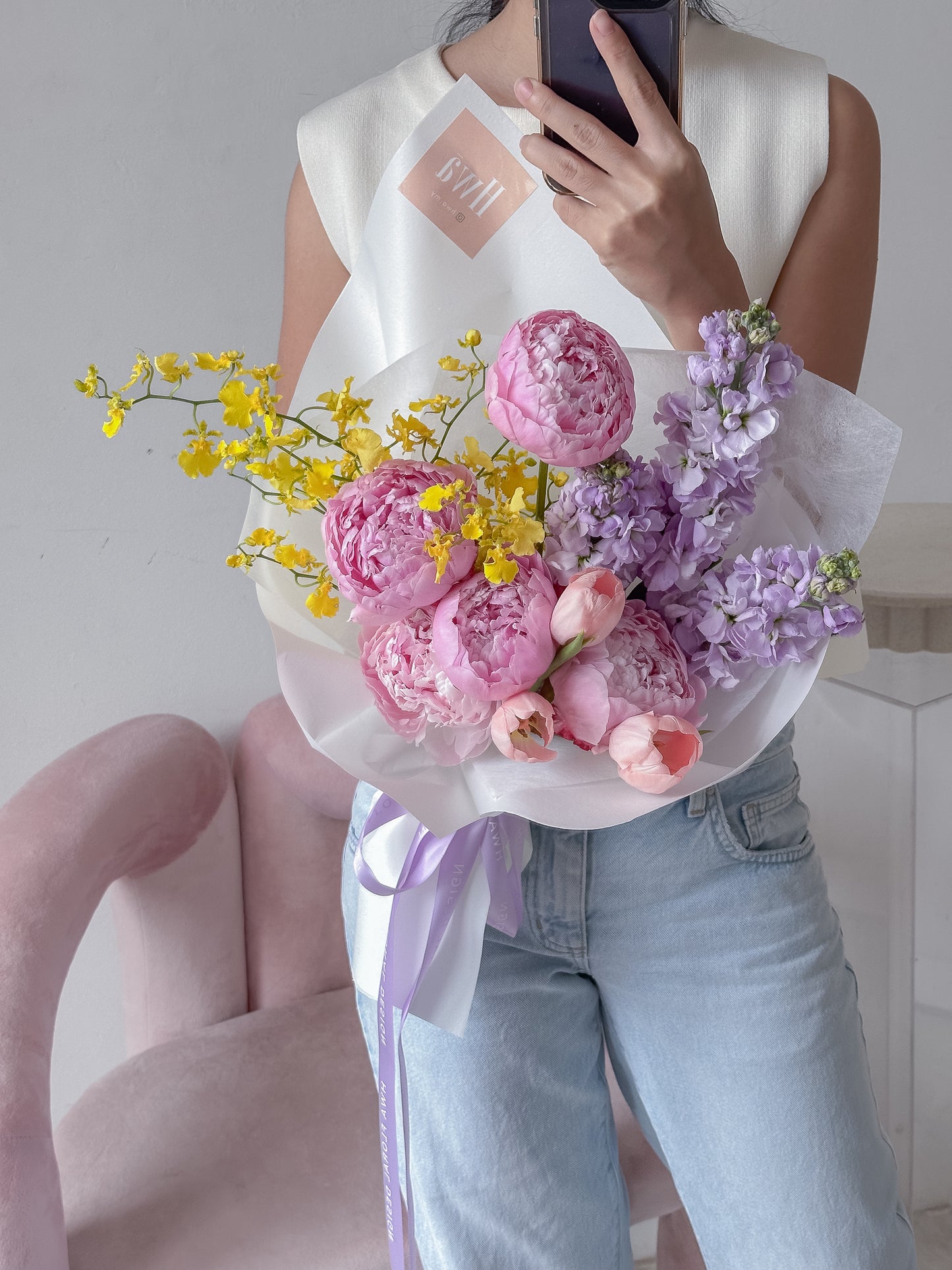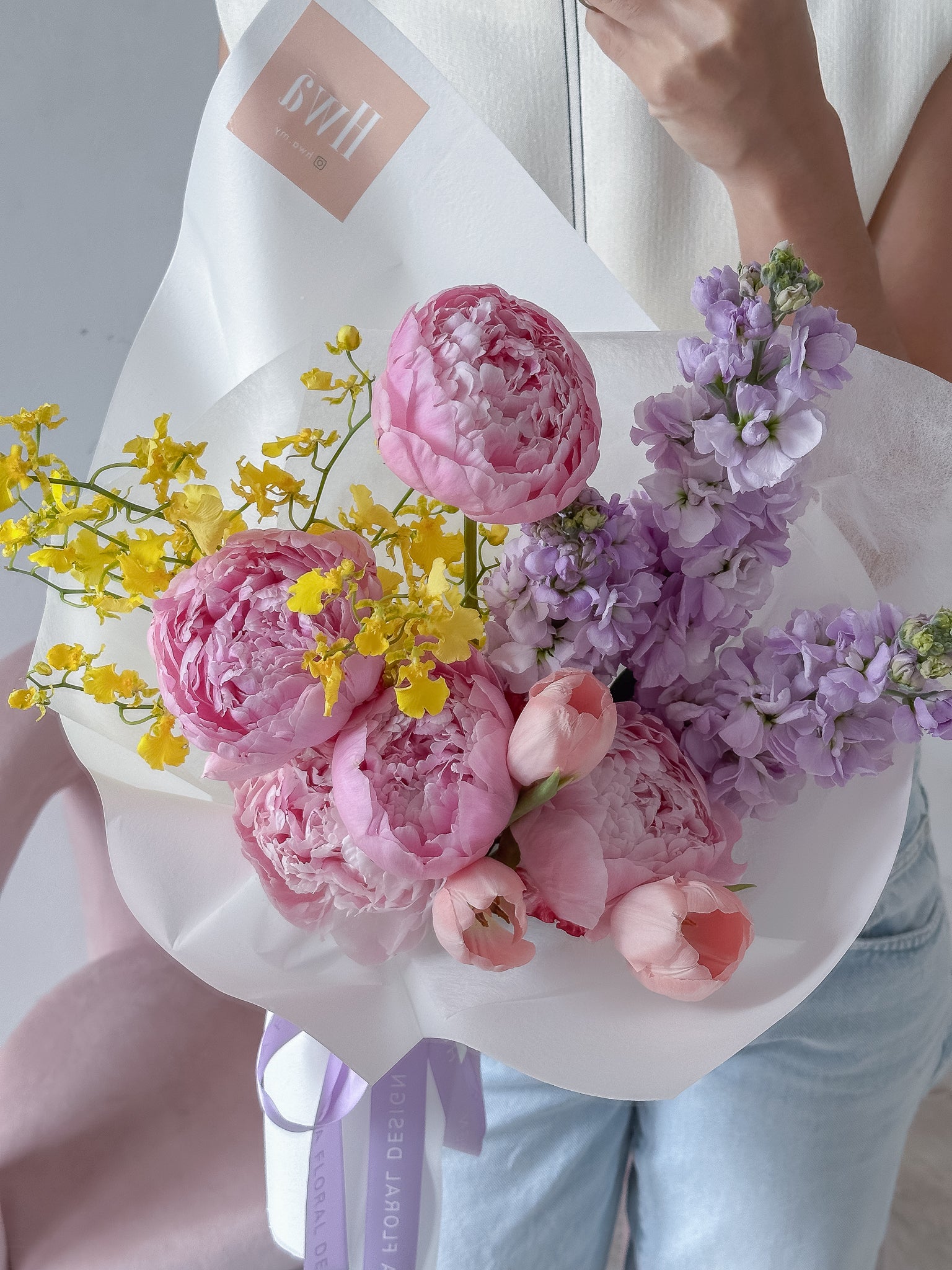 Featuring Peonies, Tulips, Dancing Lady Orchids and Matthiola.