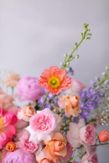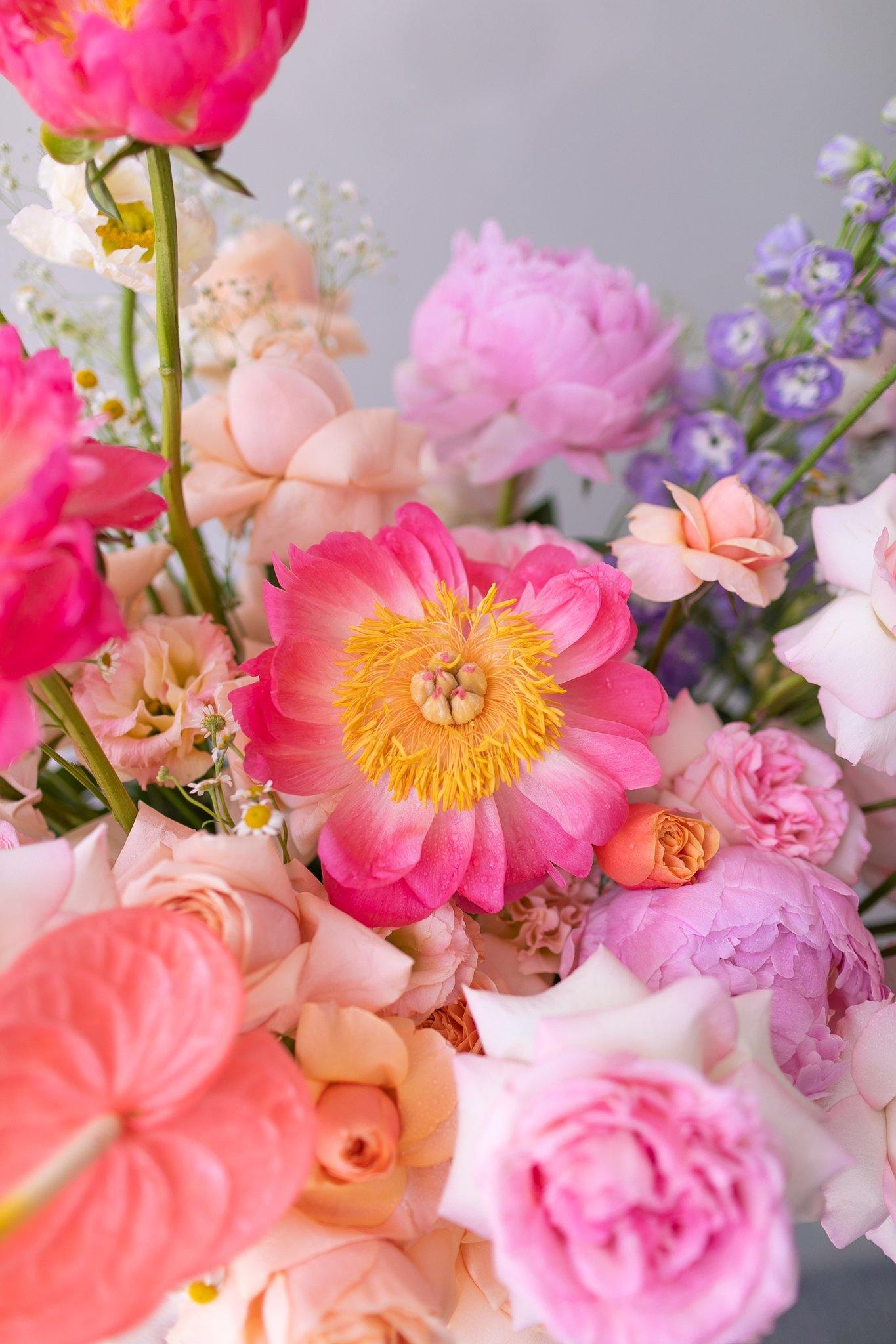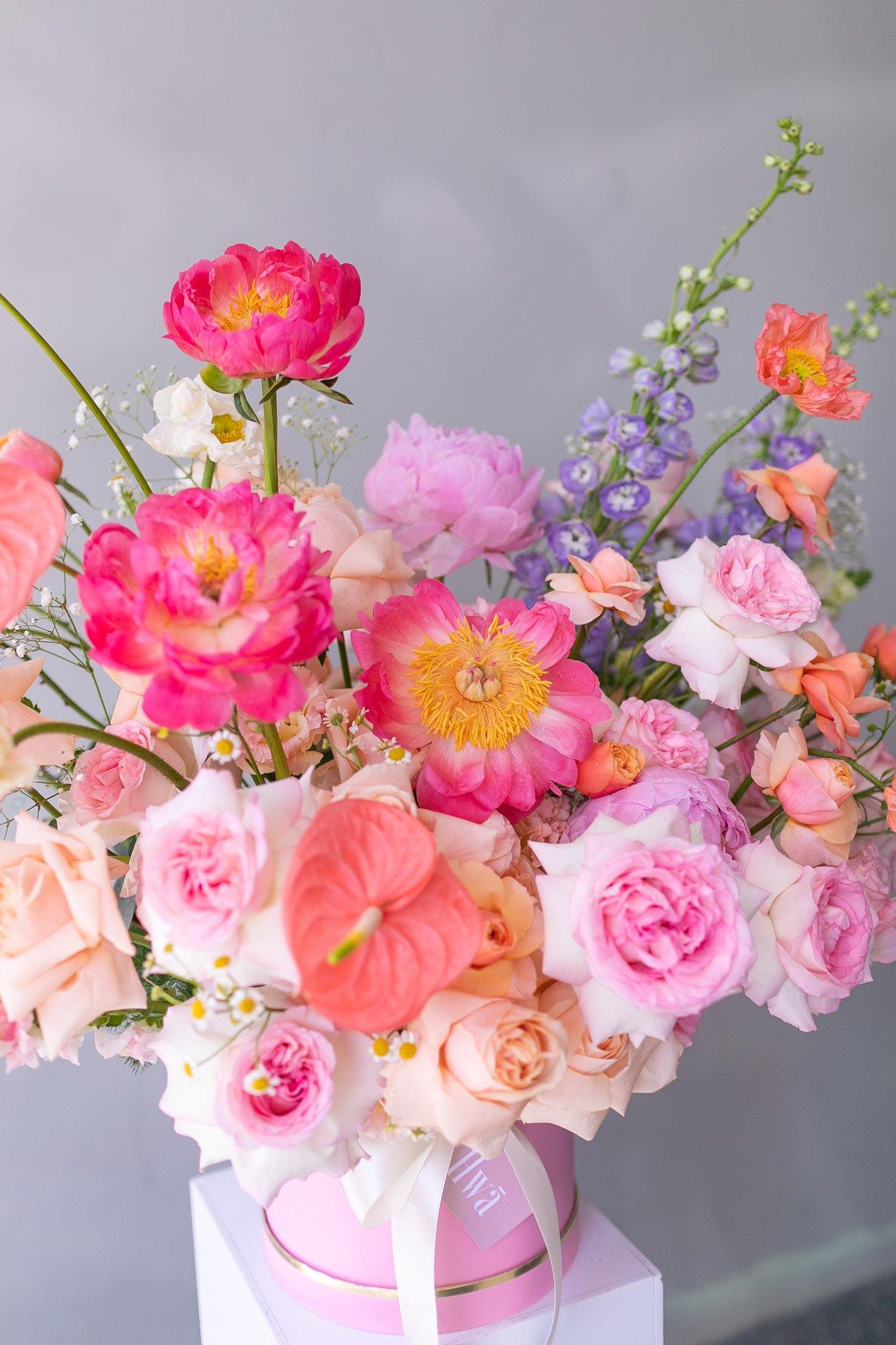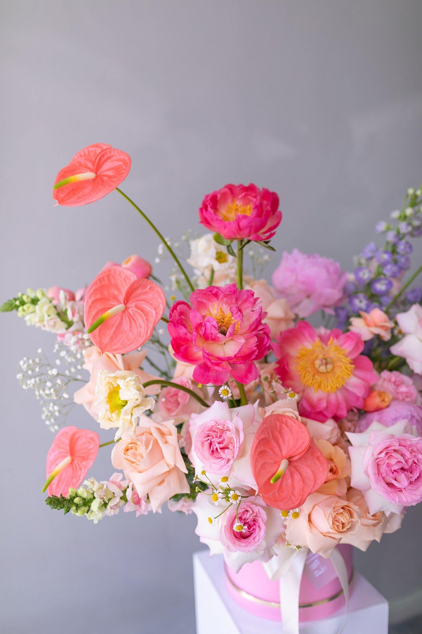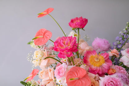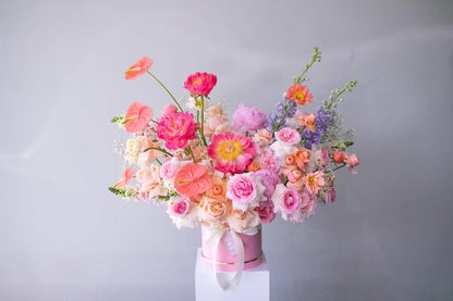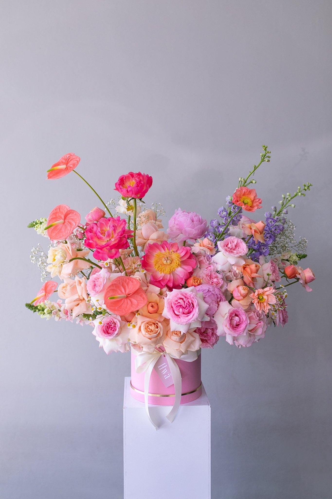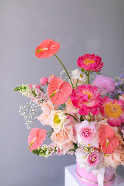 This statement box arrangement is decked out with all the rarest vibrant goodies. Complete with vibrant pink Peonies, coral Poppies and Anthuriums she is a real stunner.