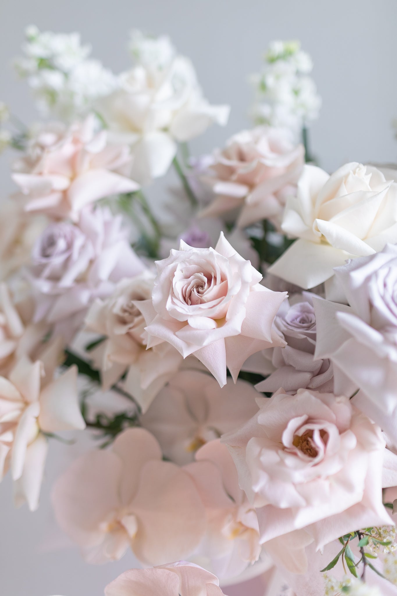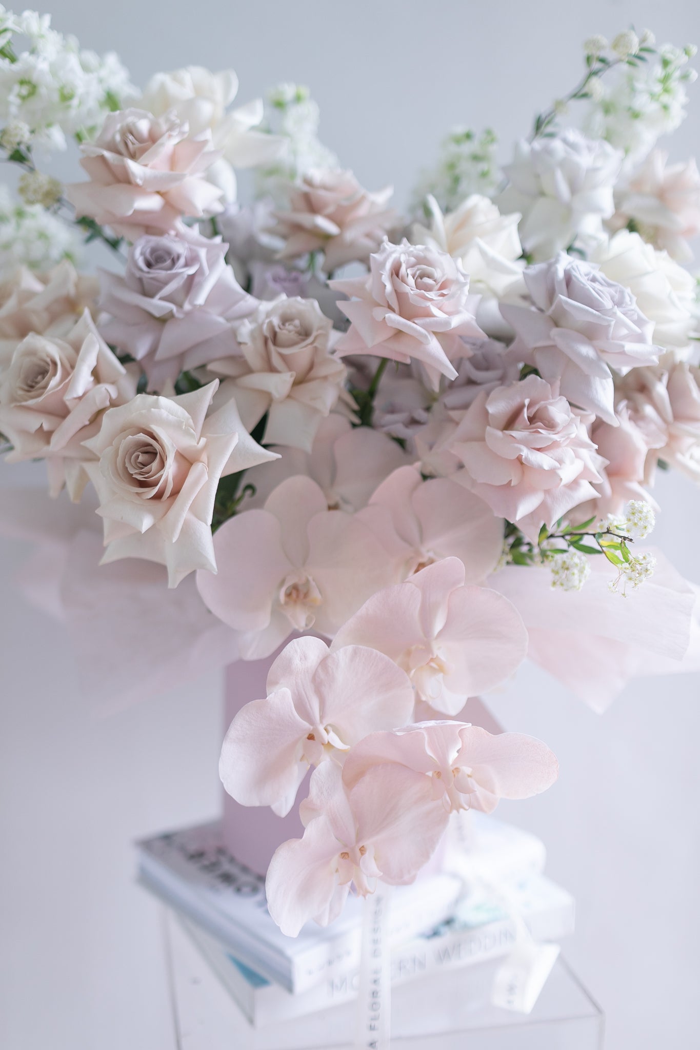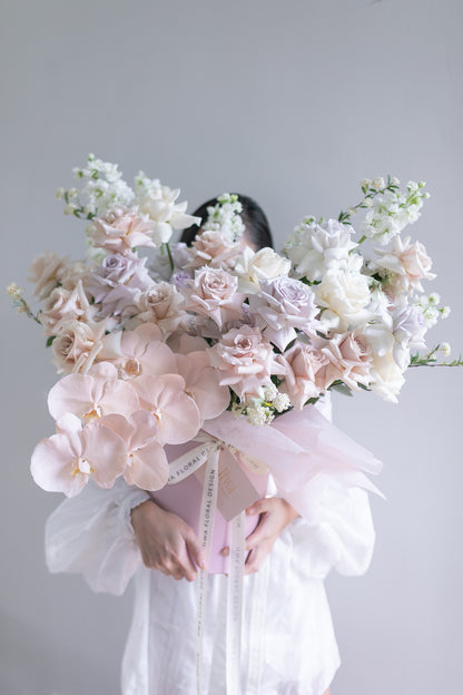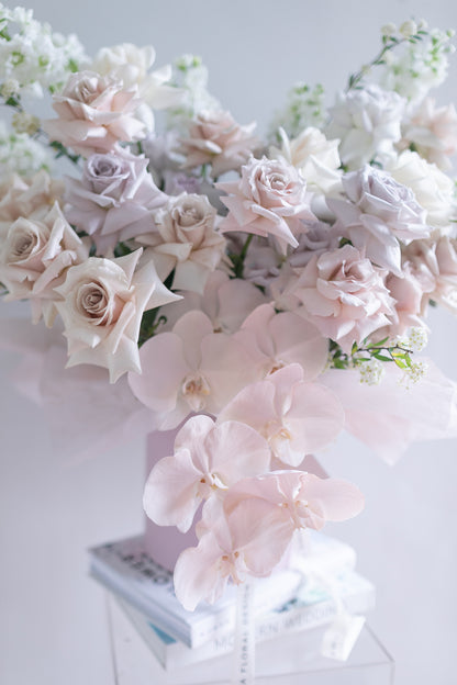 Consists of Ecuador Premium Quicksand, Menta and Vendela roses, together with custom painted Phalaenopsis and accent flowers and foliage.