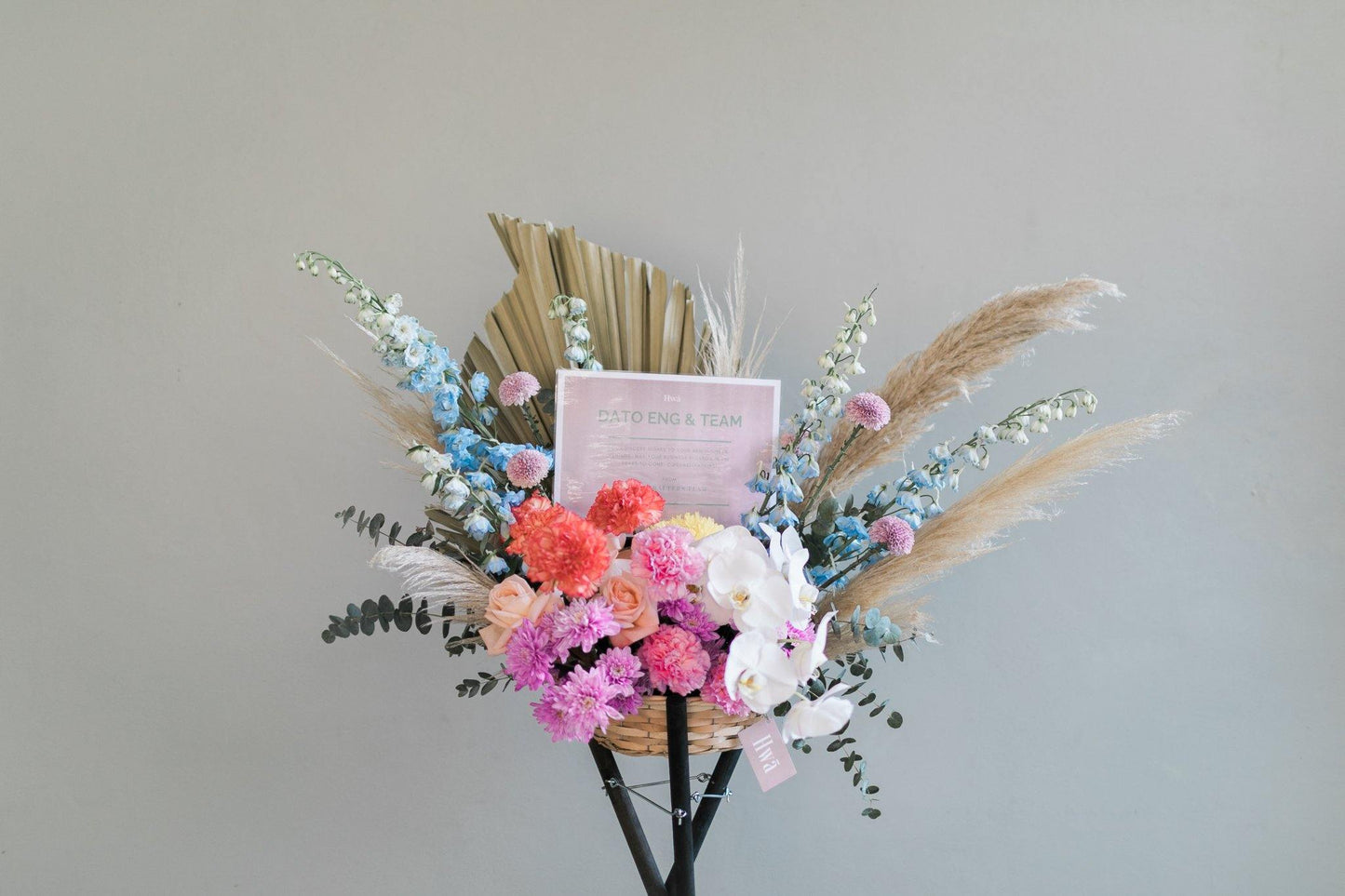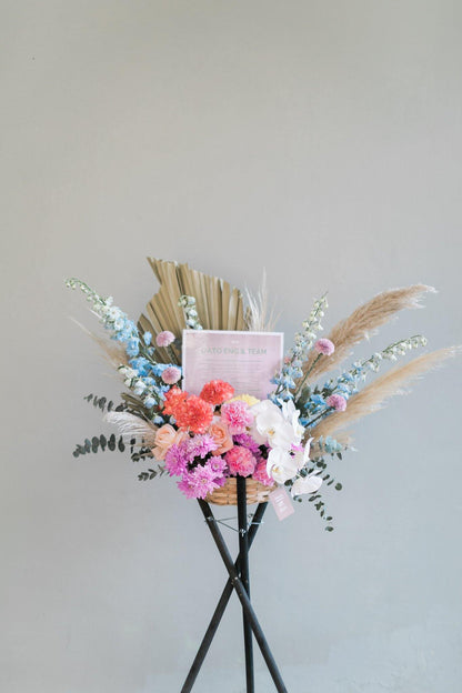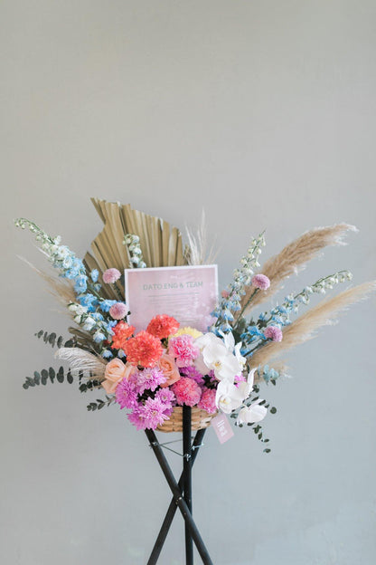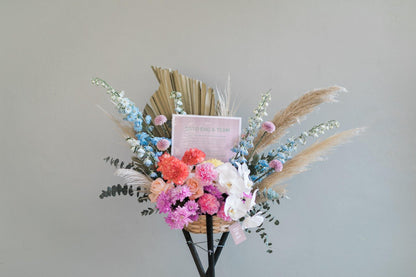 She's bold and bright, a perfect statement to say "Congratulations". Features Orchids, Delphiniums and a range of electric colored blooms topped with some Pampas for a little fuzziness.