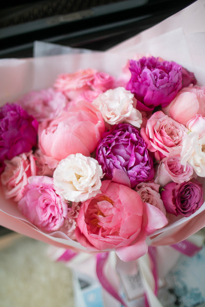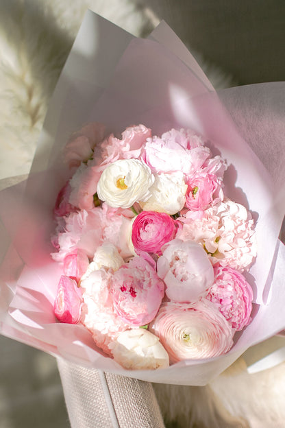 Featuring Peonies, Ranunculus, Eustoma and Roses, all of which have traditionally been known to symbolise love, honor, romance and beauty. Convey your truest feelings to your loved one with this meaningful bouquet.