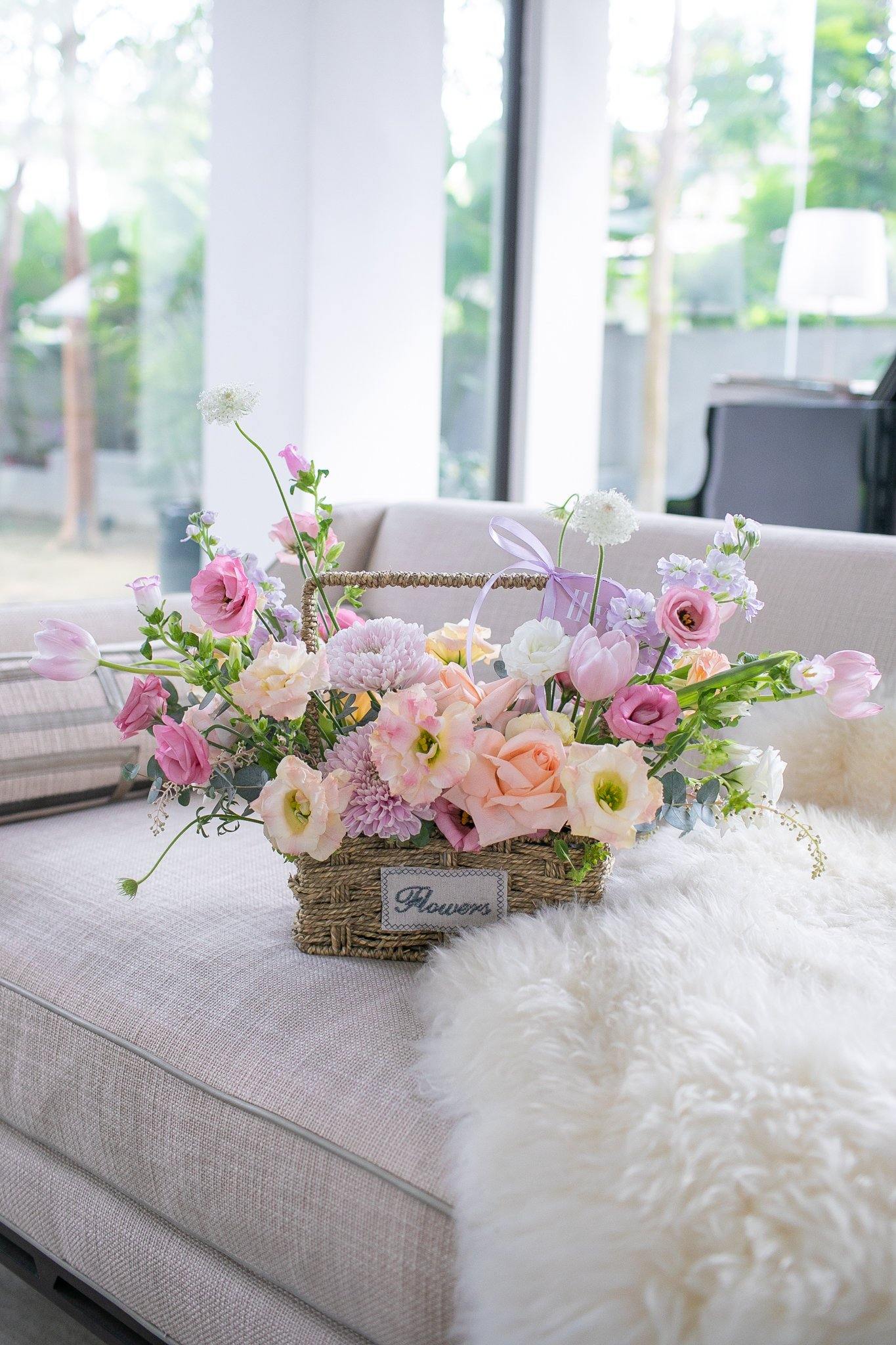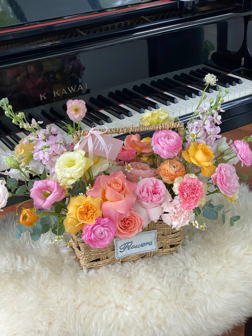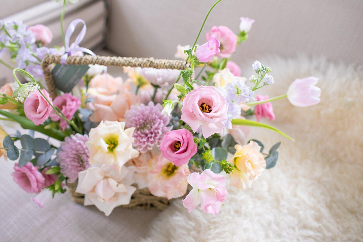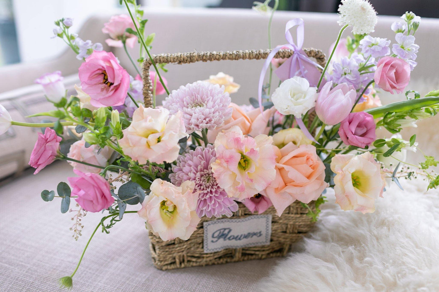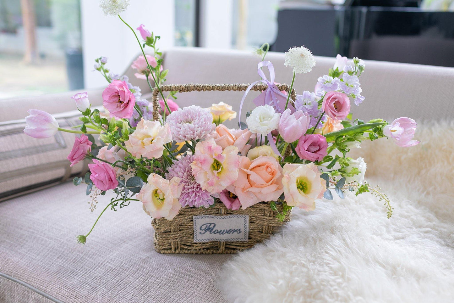 Our best-selling large basket arrangement in pastel tones. Features Rose, Eustoma, Matthiola, and seasonal accent flowers and foliage.