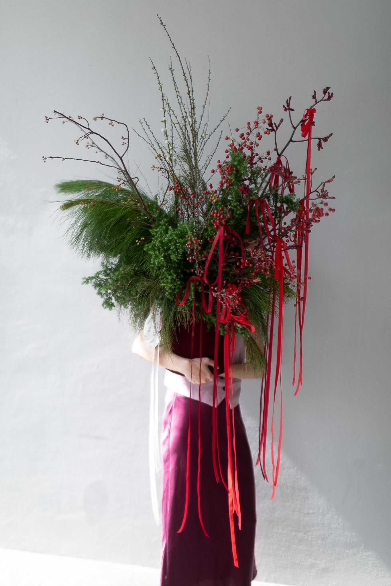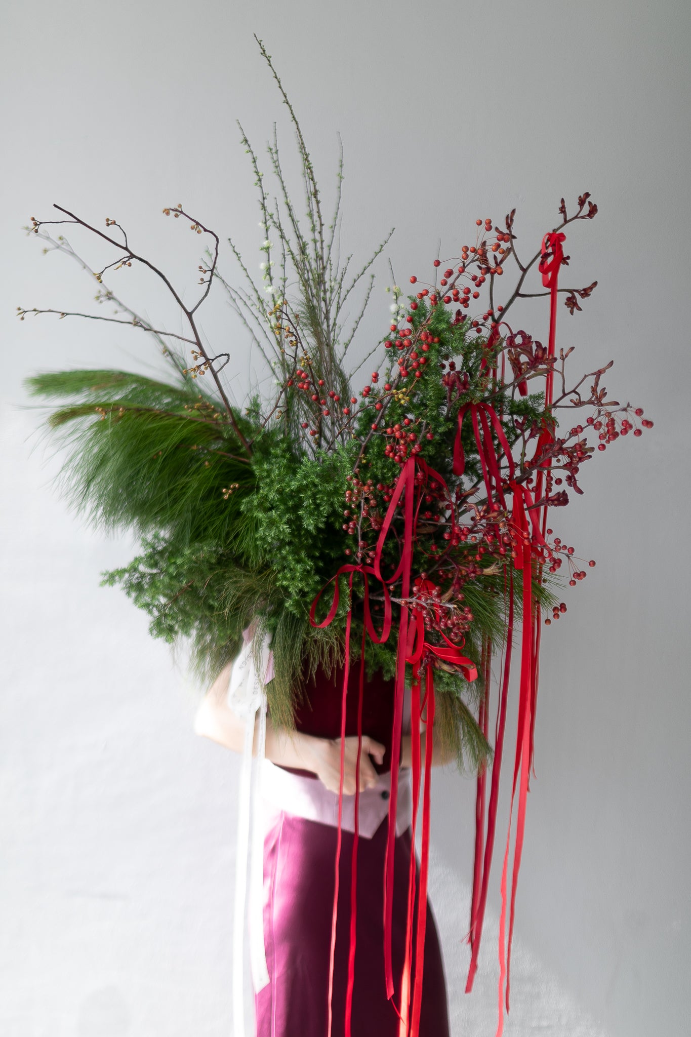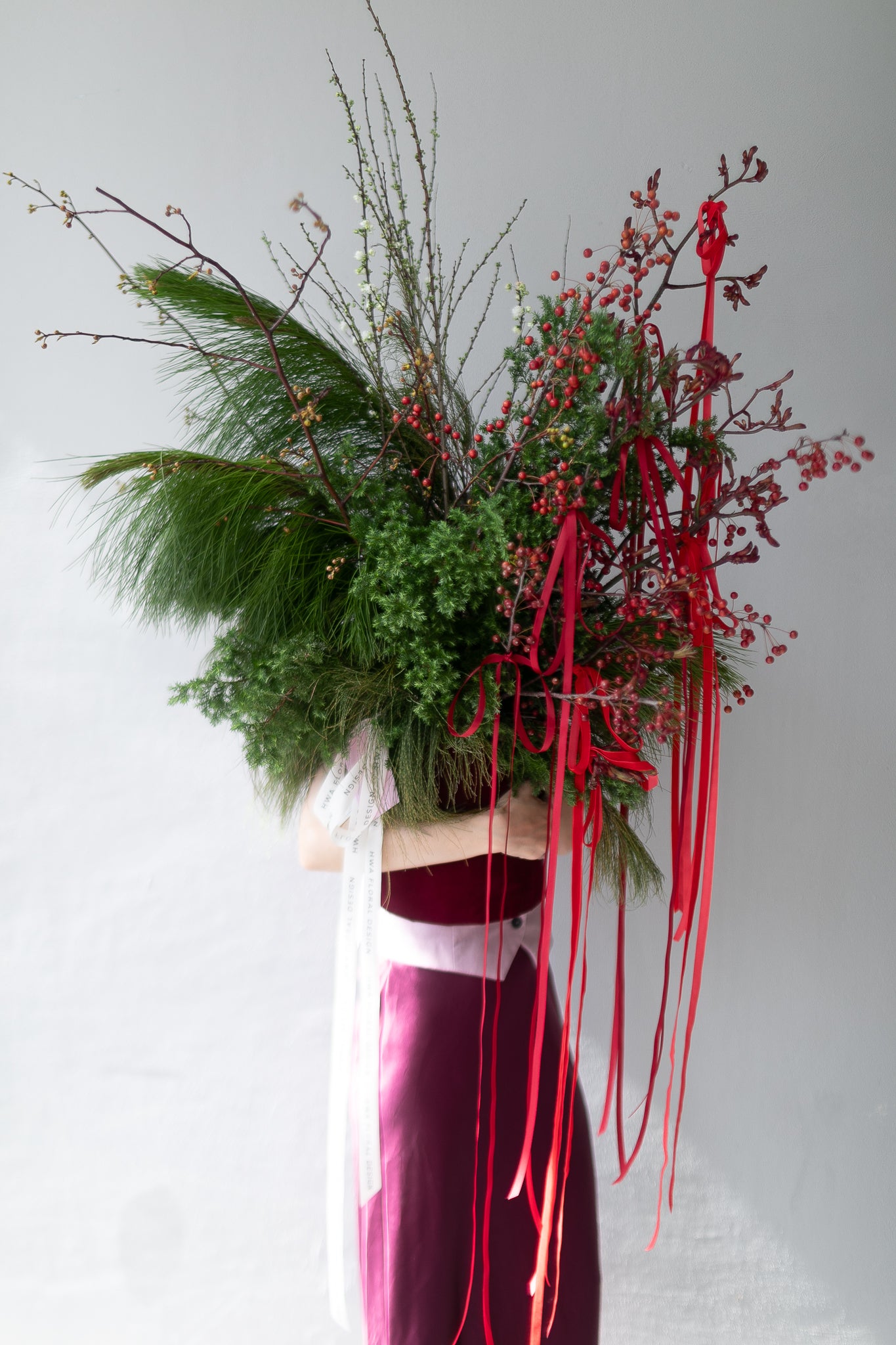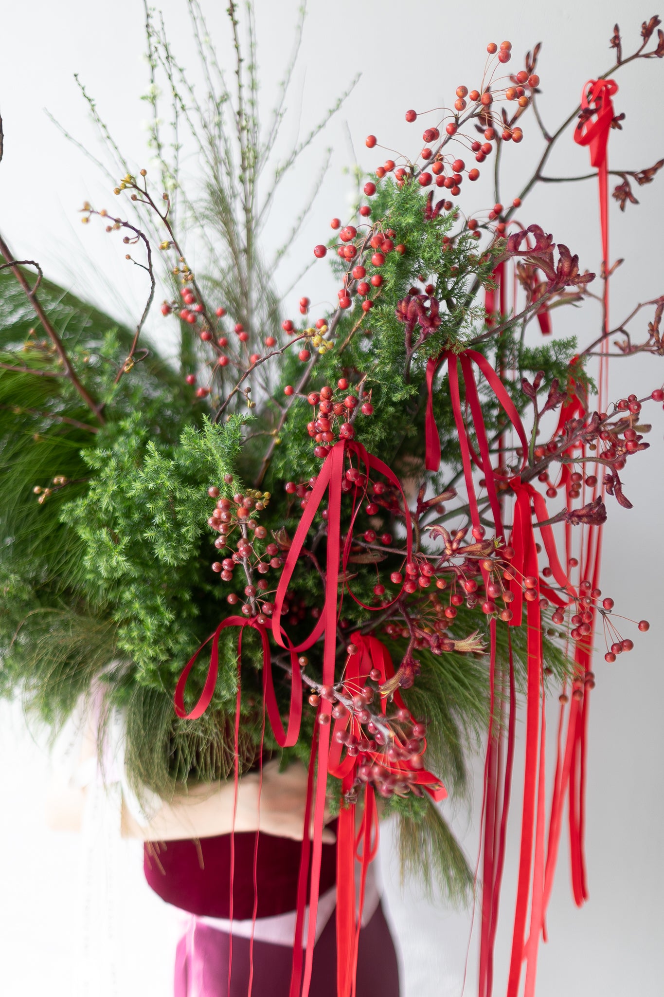 Made of earthy warm pine and cedar leaves together with blossoming branches and thoughtfully adorned with ribbons en masse. It is sure to elevate any space this holiday season.