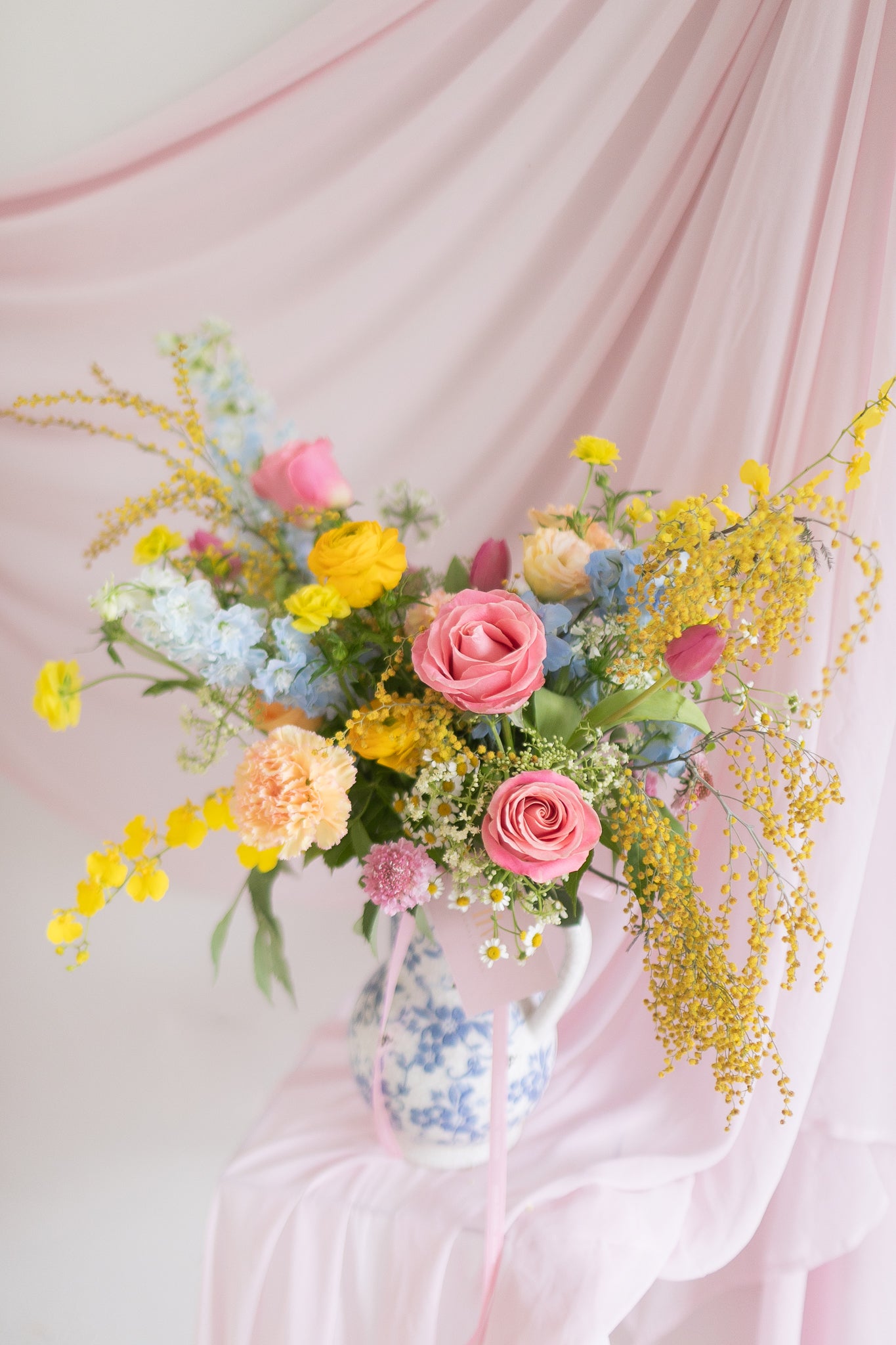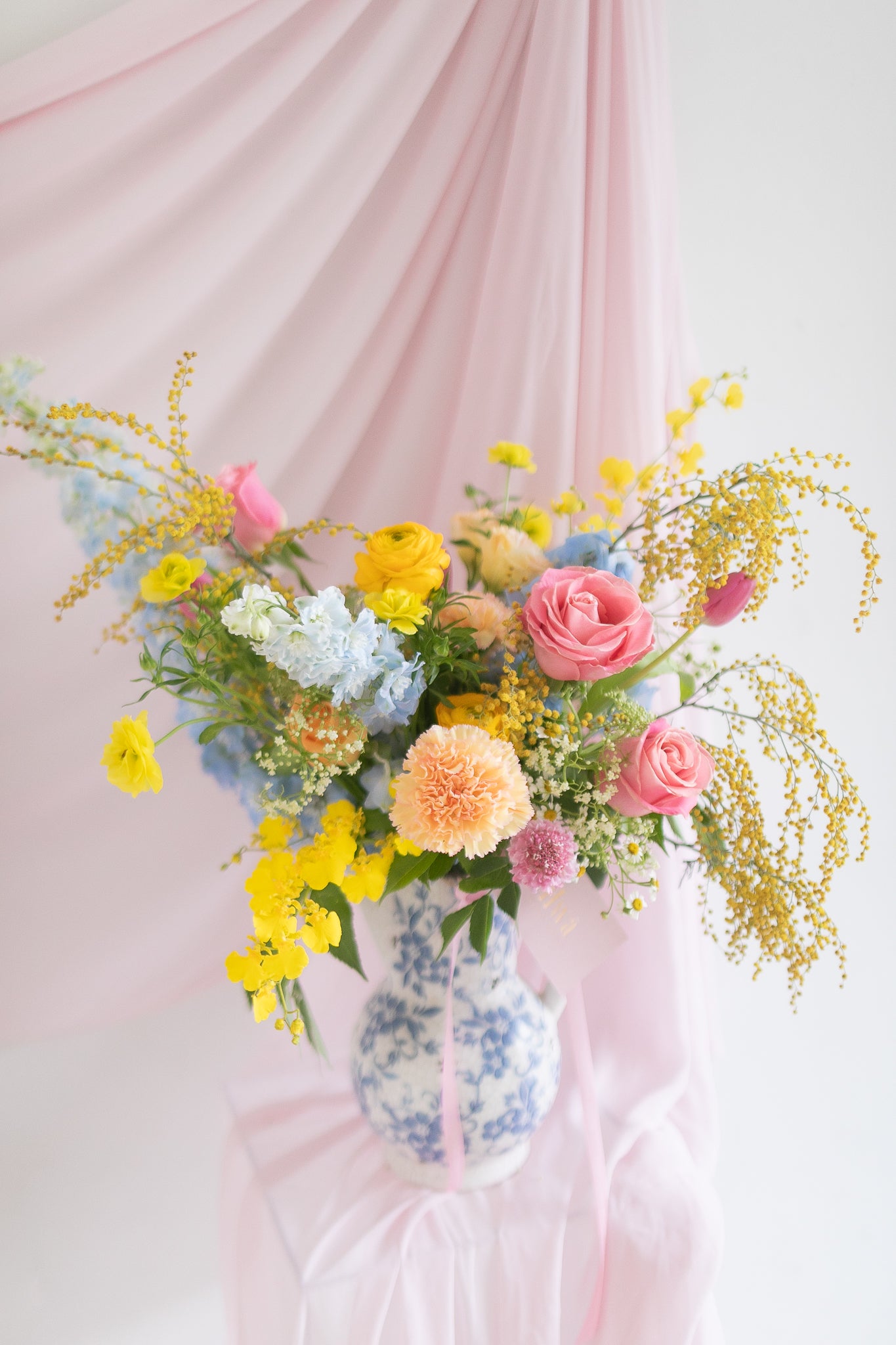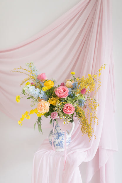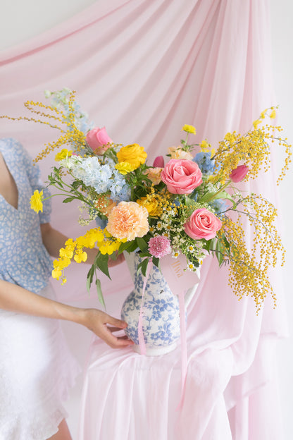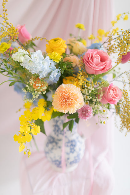 Drawing inspiration from the timeless elegance and poetic legacy of Wenji Cai, Lady Wen exudes sophistication and grace. This stunning arrangement features soft pastel blue and pink tones, complemented by the cheerful brightness of golden yellow flowers, symbolizing joy and prosperity.