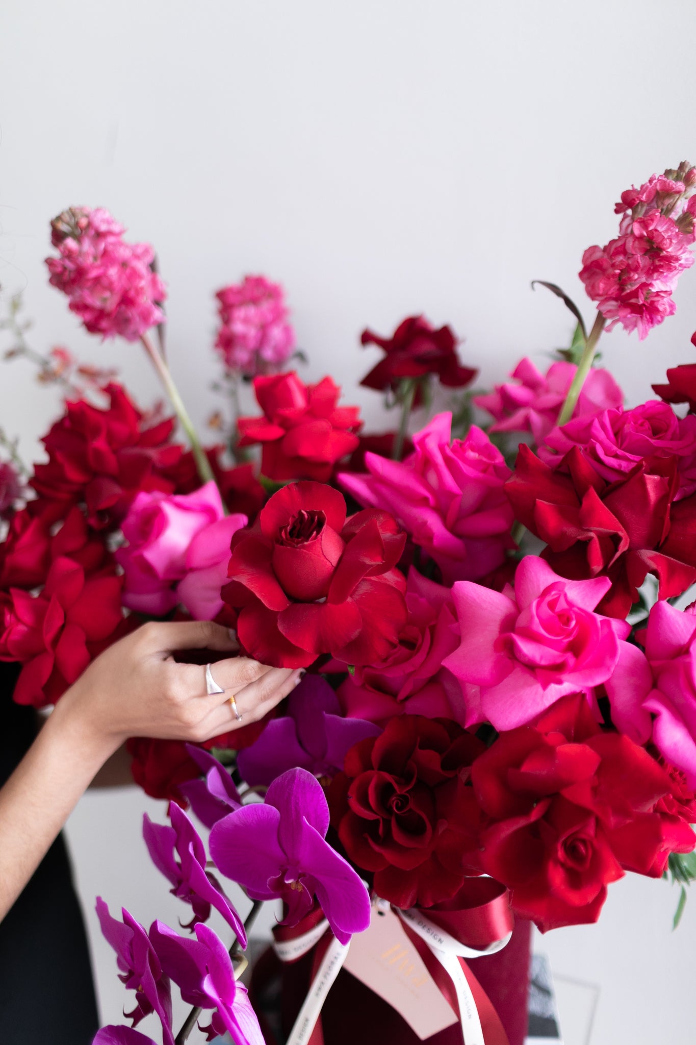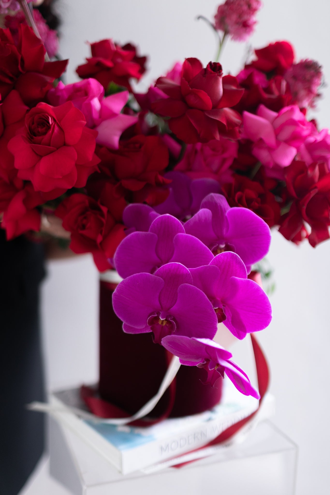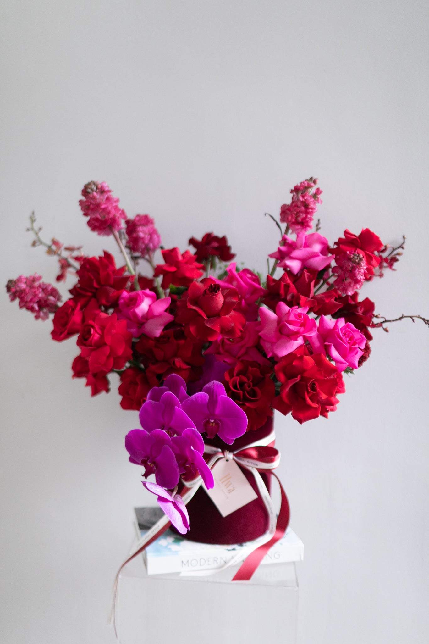 A luxurious pairing of deep Red and Pantone's color of the year - Magenta. The perfect duo to celebrate love. Focal ingredients used are none other than Kenya Premium Roses and Phalaenopsis Orchids complimented with other accent flowers and foliage.