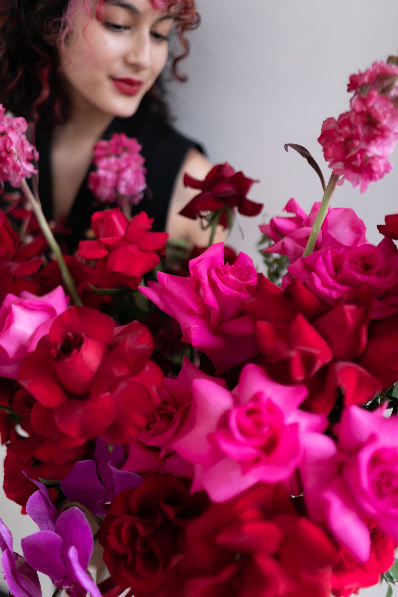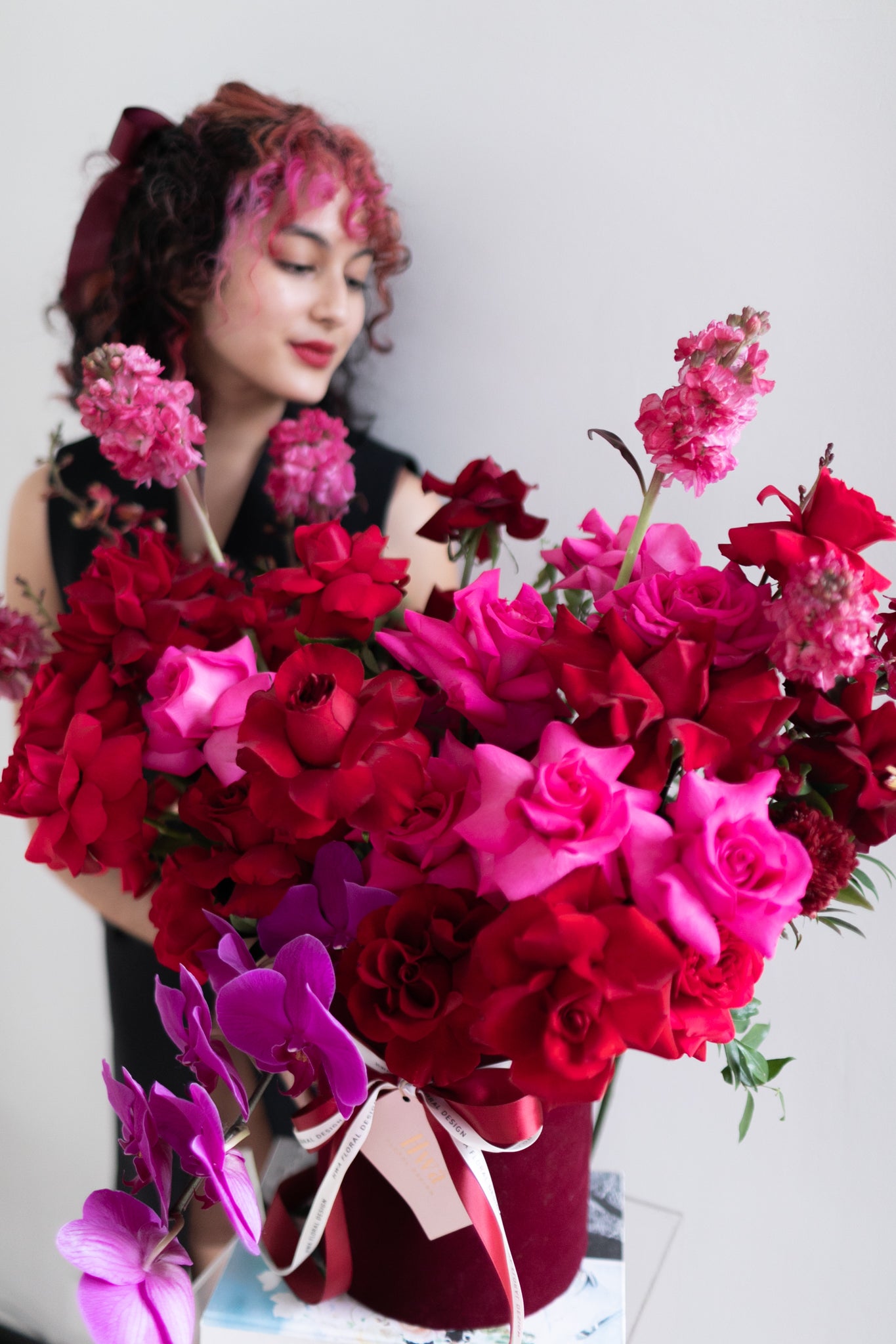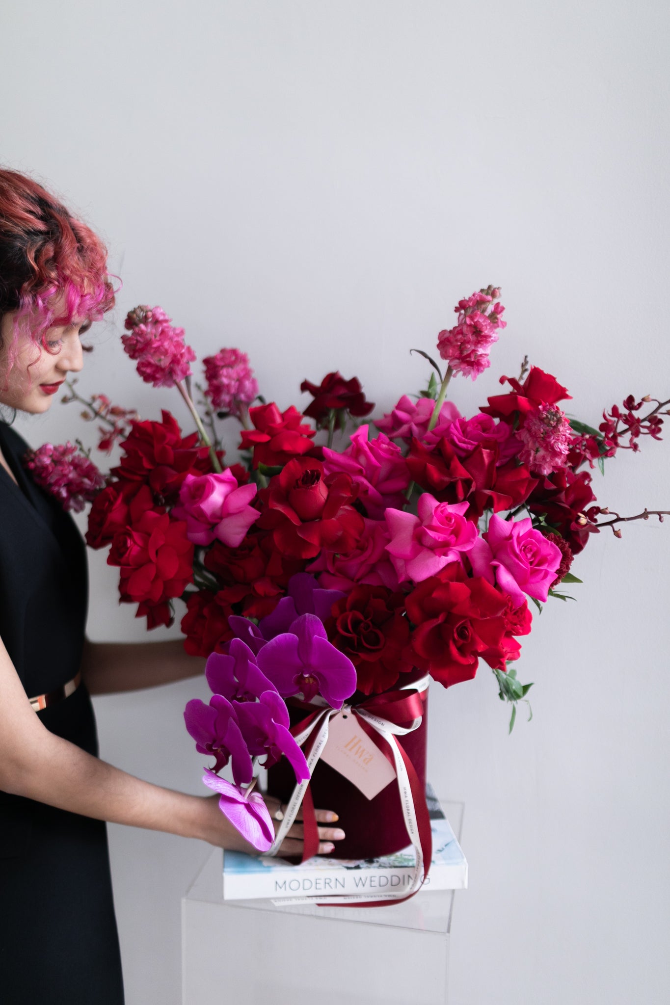 A luxurious pairing of deep Red and Pantone's color of the year - Magenta. The perfect duo to celebrate love. Focal ingredients used are none other than Kenya Premium Roses and Phalaenopsis Orchids complimented with other accent flowers and foliage.