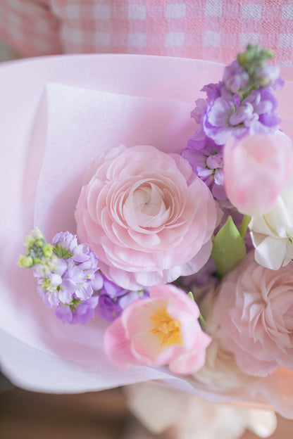A whimsical bouquet filled with fluffy pink goodness and lilac touches.
