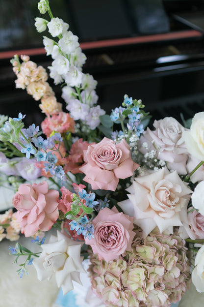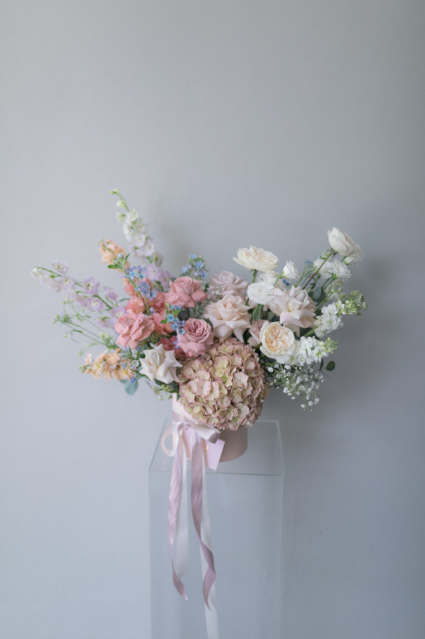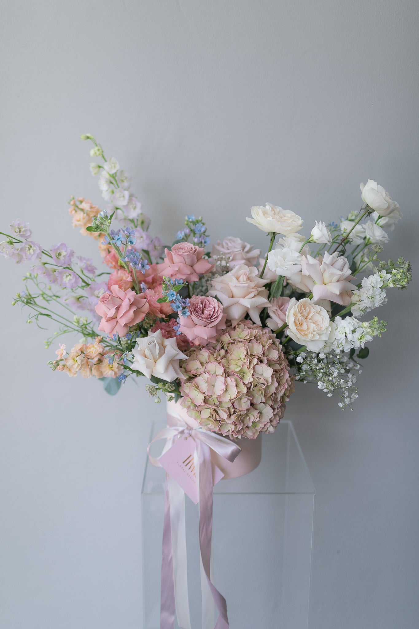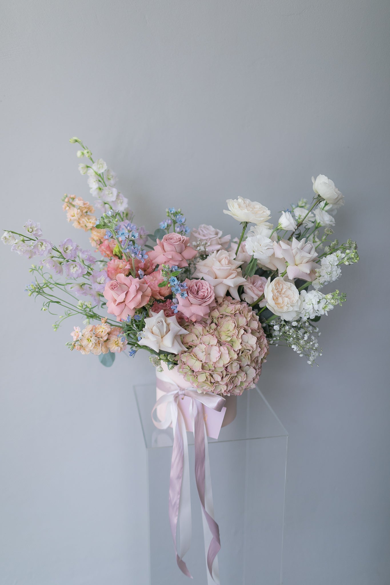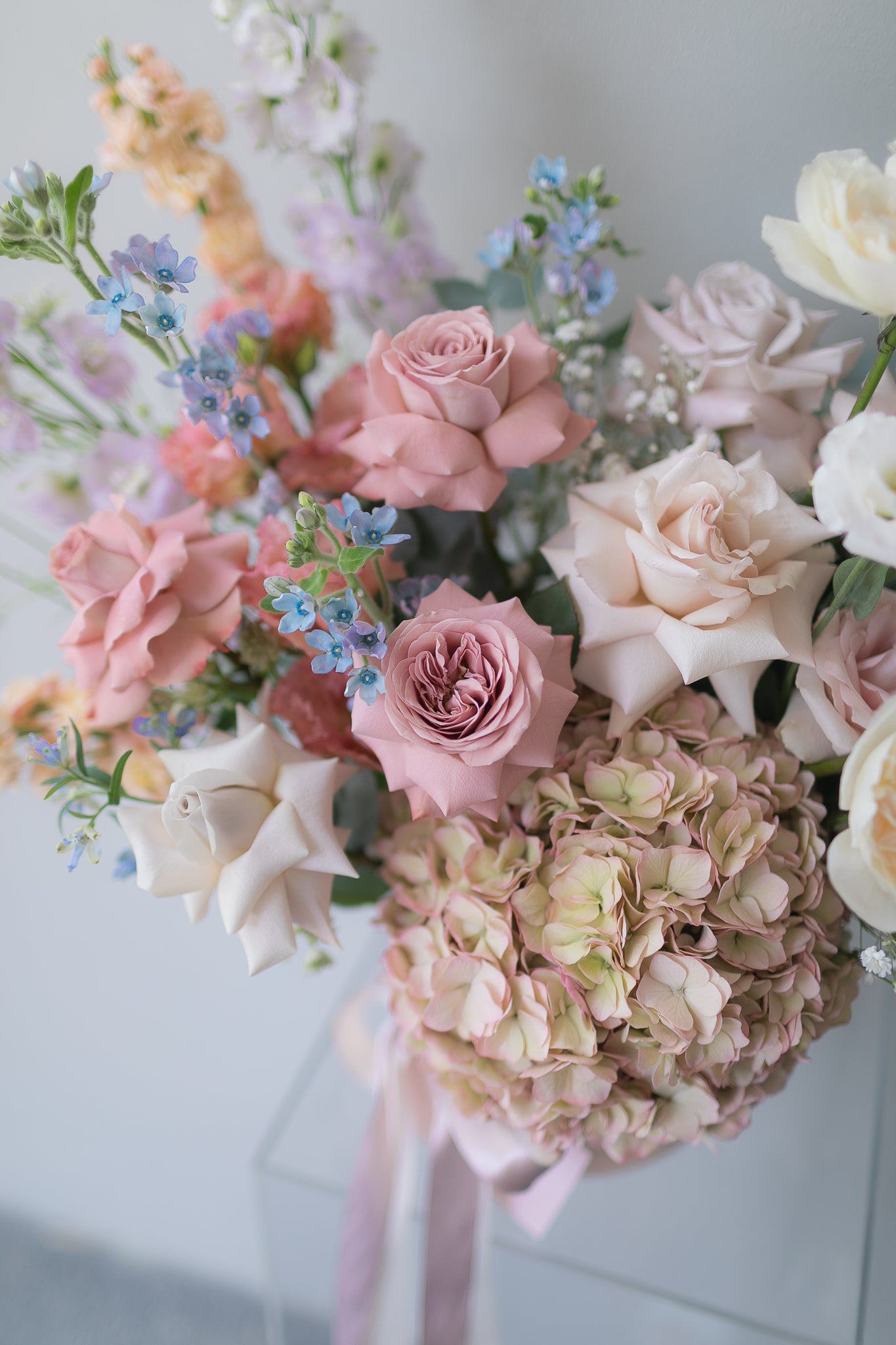 A floral box arrangement with a soft creamy nude palette and hints of blue.
