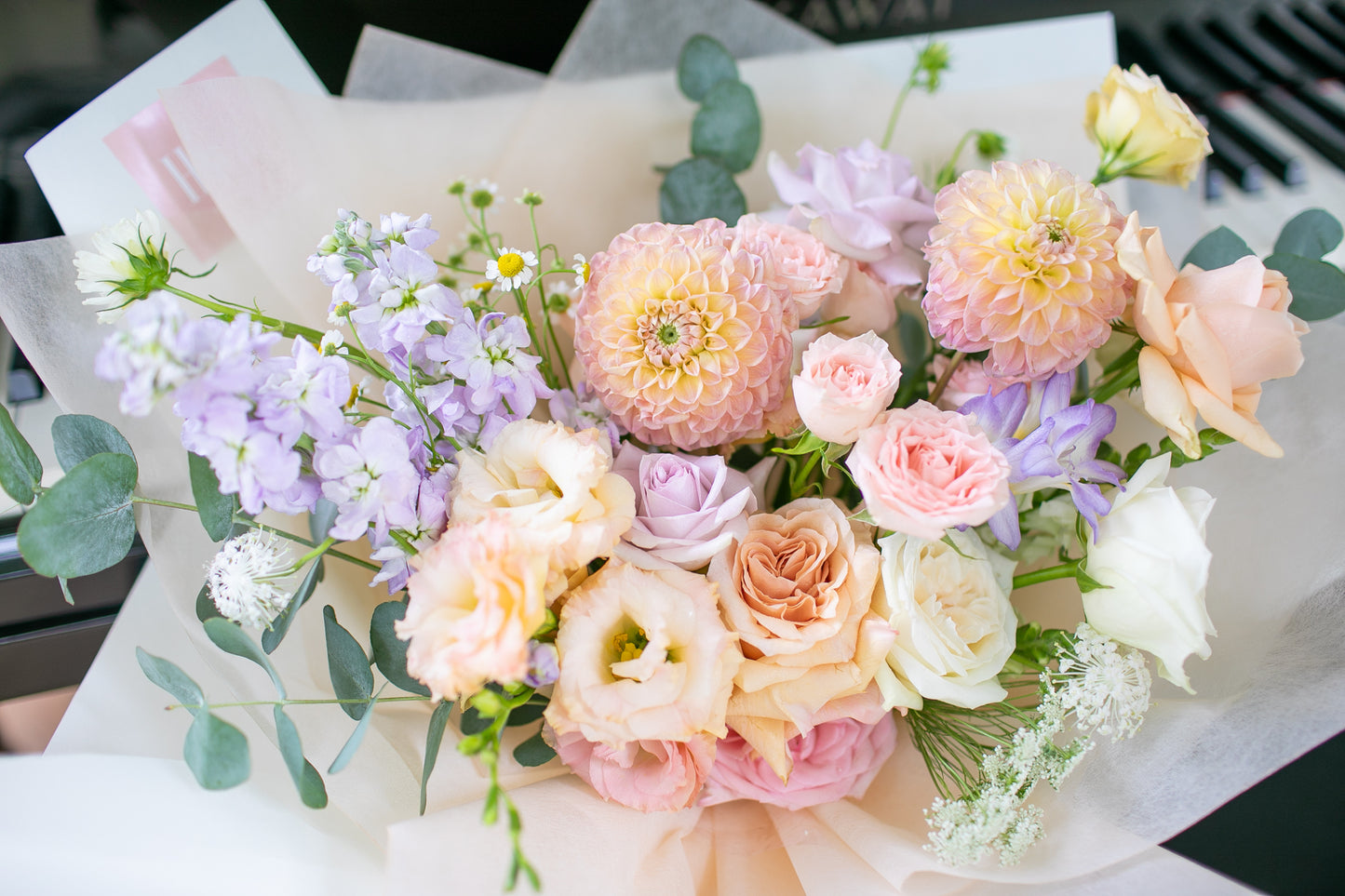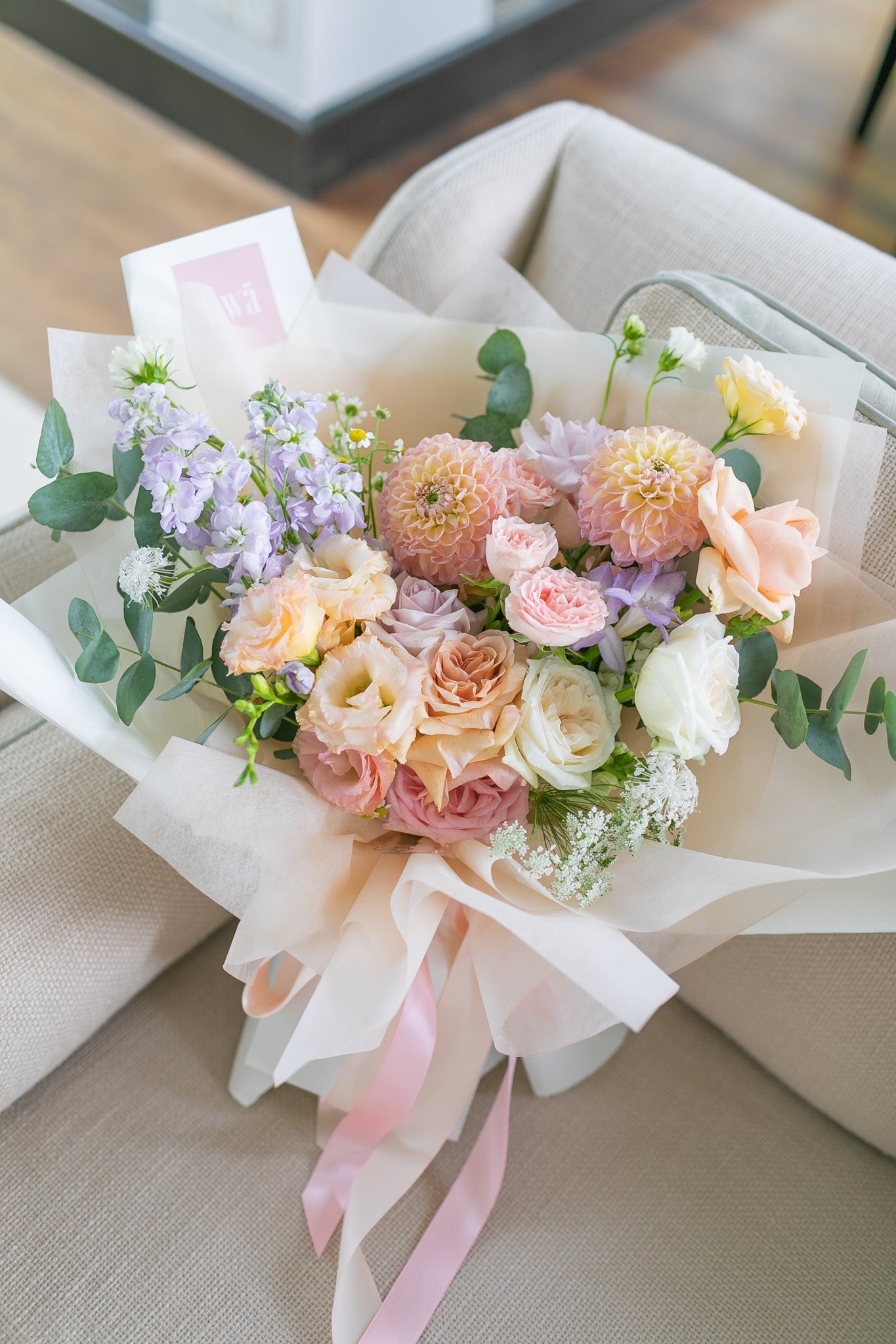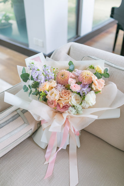 This bouquet boasts a variety of light pastel florals in a soft playful palette.