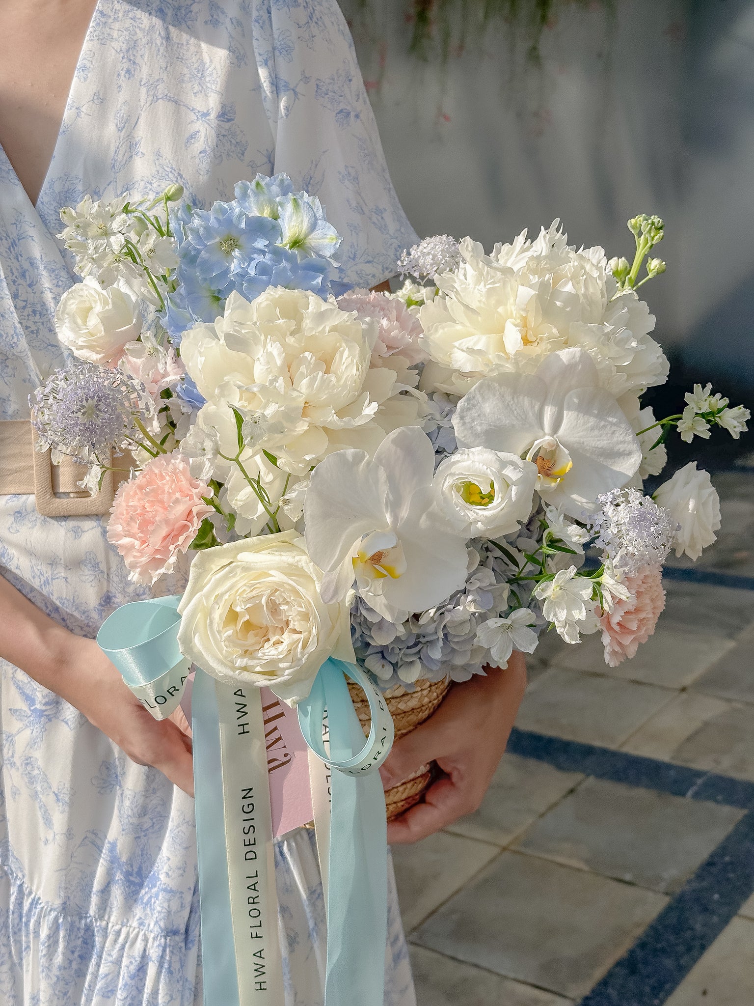 Be swept away by Peony de Lune, a luxurious basket of opulent flowers in shades of white and blue. From romantic plush Peonies to sweet Lychee roses and Hydrangea, each bloom represents love, honor, and beauty. Perfect for expressing heartfelt sentiments to your beloved.