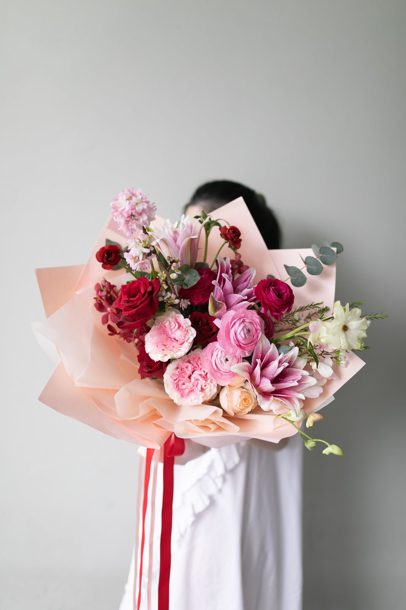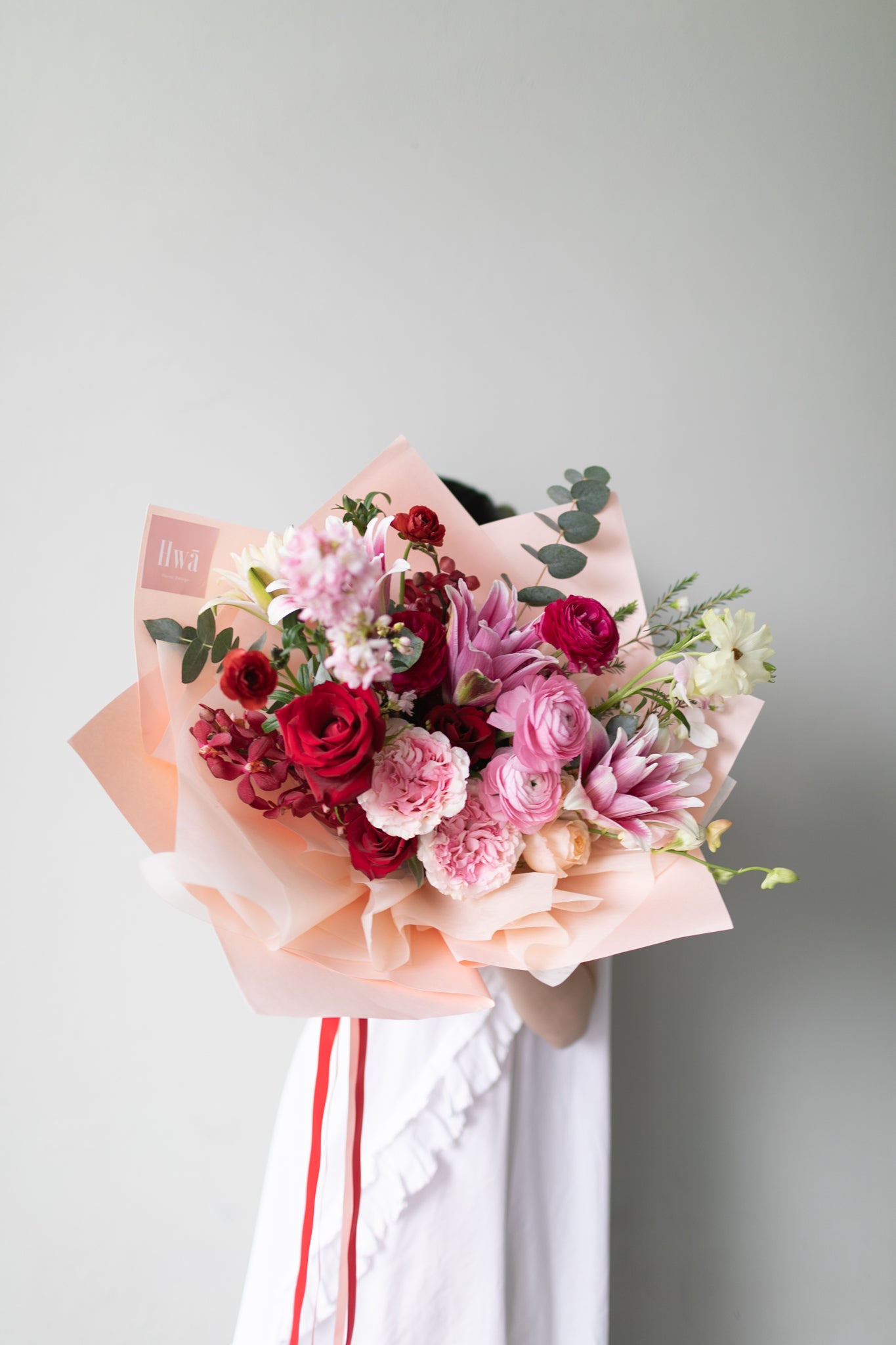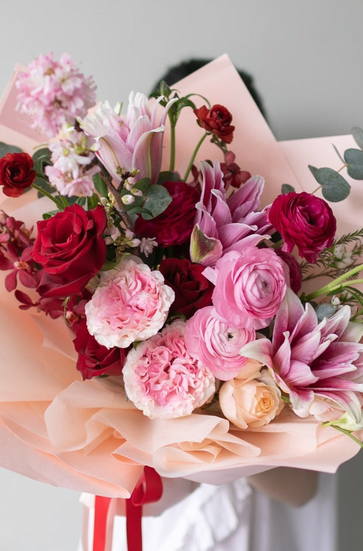 Adorn mom with this treasure trove of a bouquet filled with rich ruby red flowers complimented with contrasting pink statement blooms. She'll be feeling pampered all week with this on her dining table.
