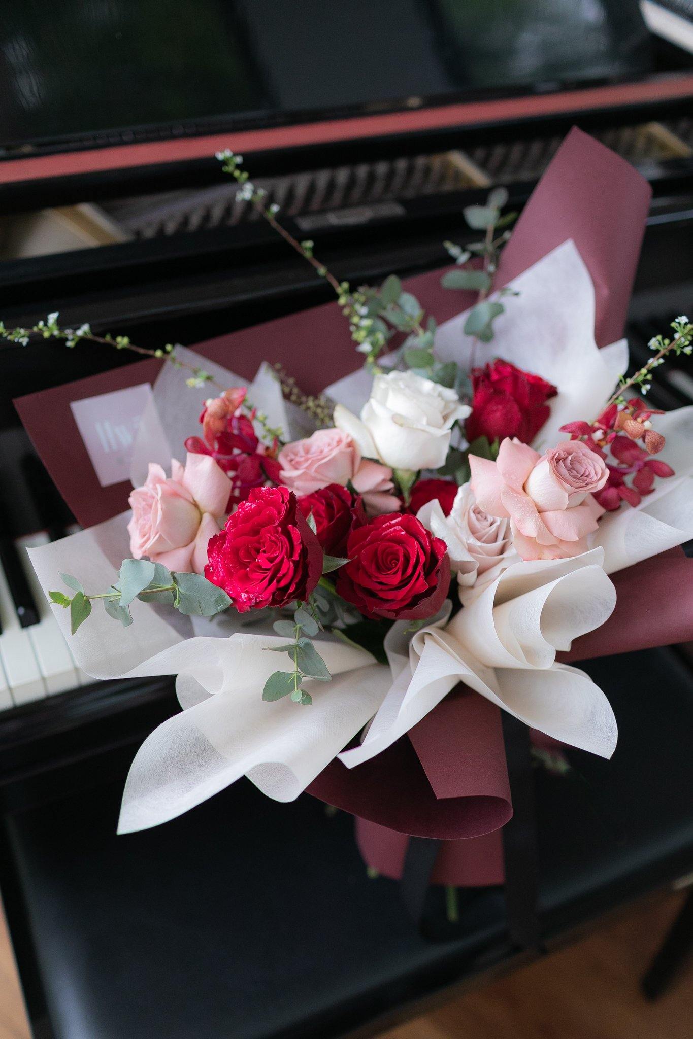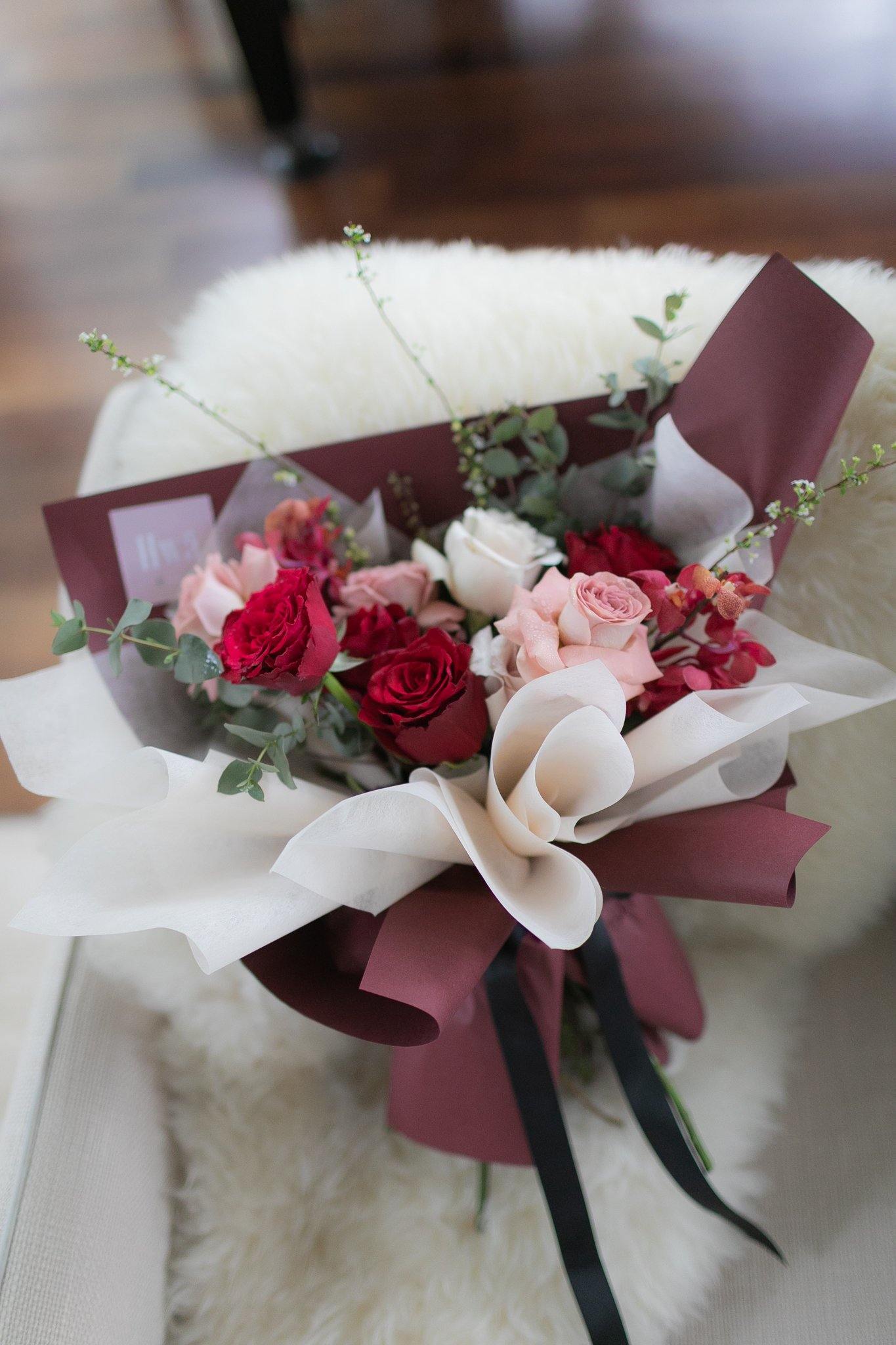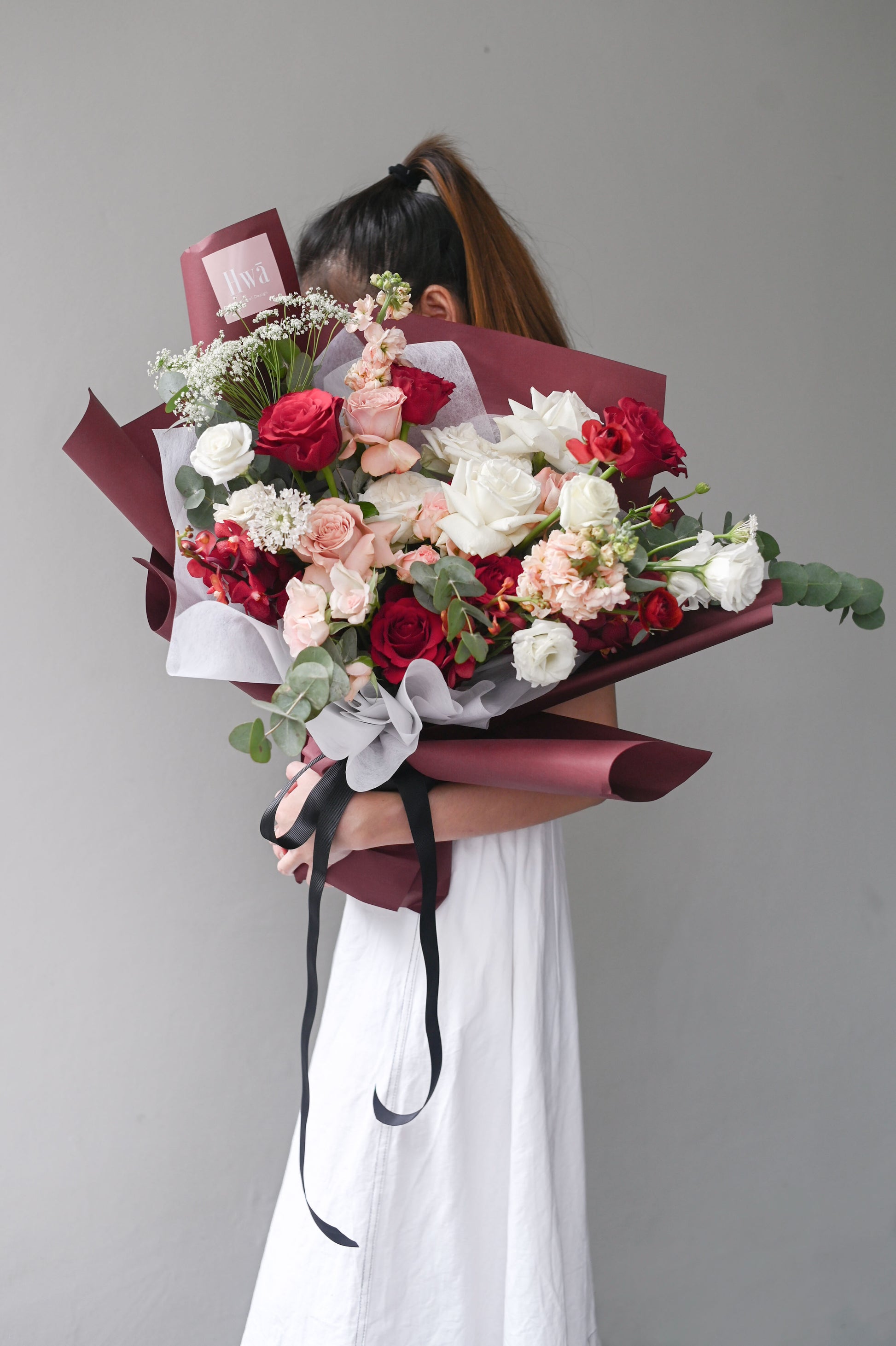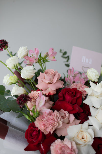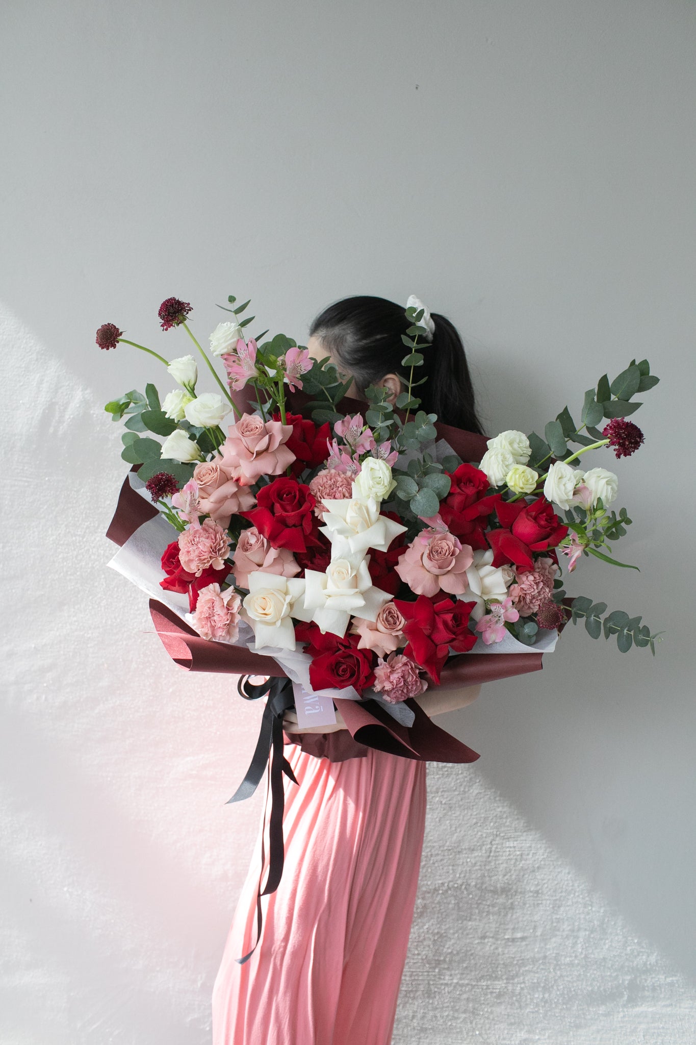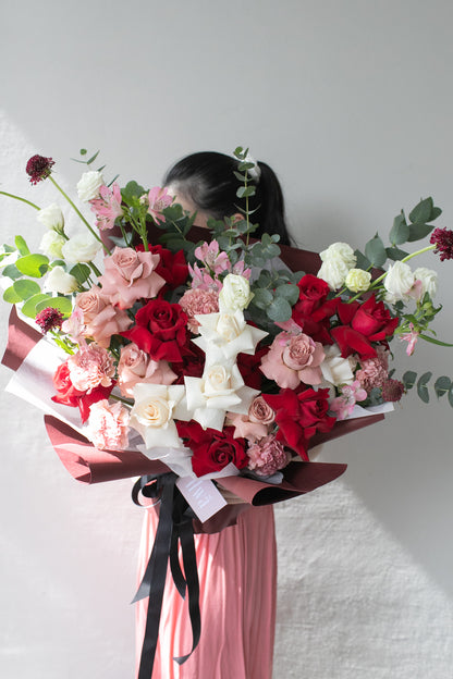 A classic red rose bouquet with our favourite dusty pink Cappuccino rose to soften the palette. Finished with elegant leaves to add texture and give a romantic garden vibe.