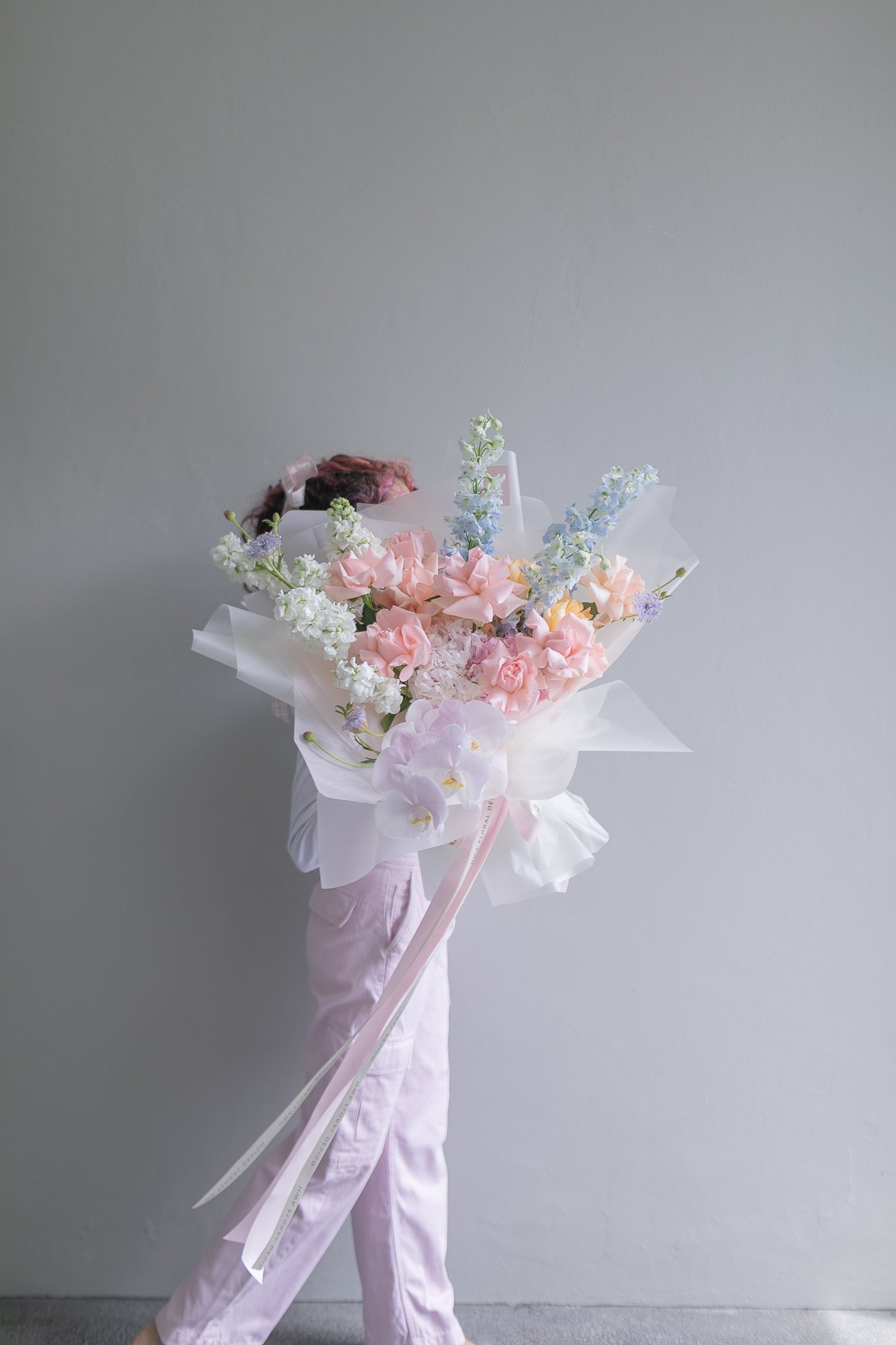Sugar spice and everything nice, this bouquet is a pastel rainbow that is both sweet and delicate yet edgy and modern at the same time. With a blend of baby blues, light pinks and buttery pastel tones, your girl is sure to melt at the sight of this bouquet.