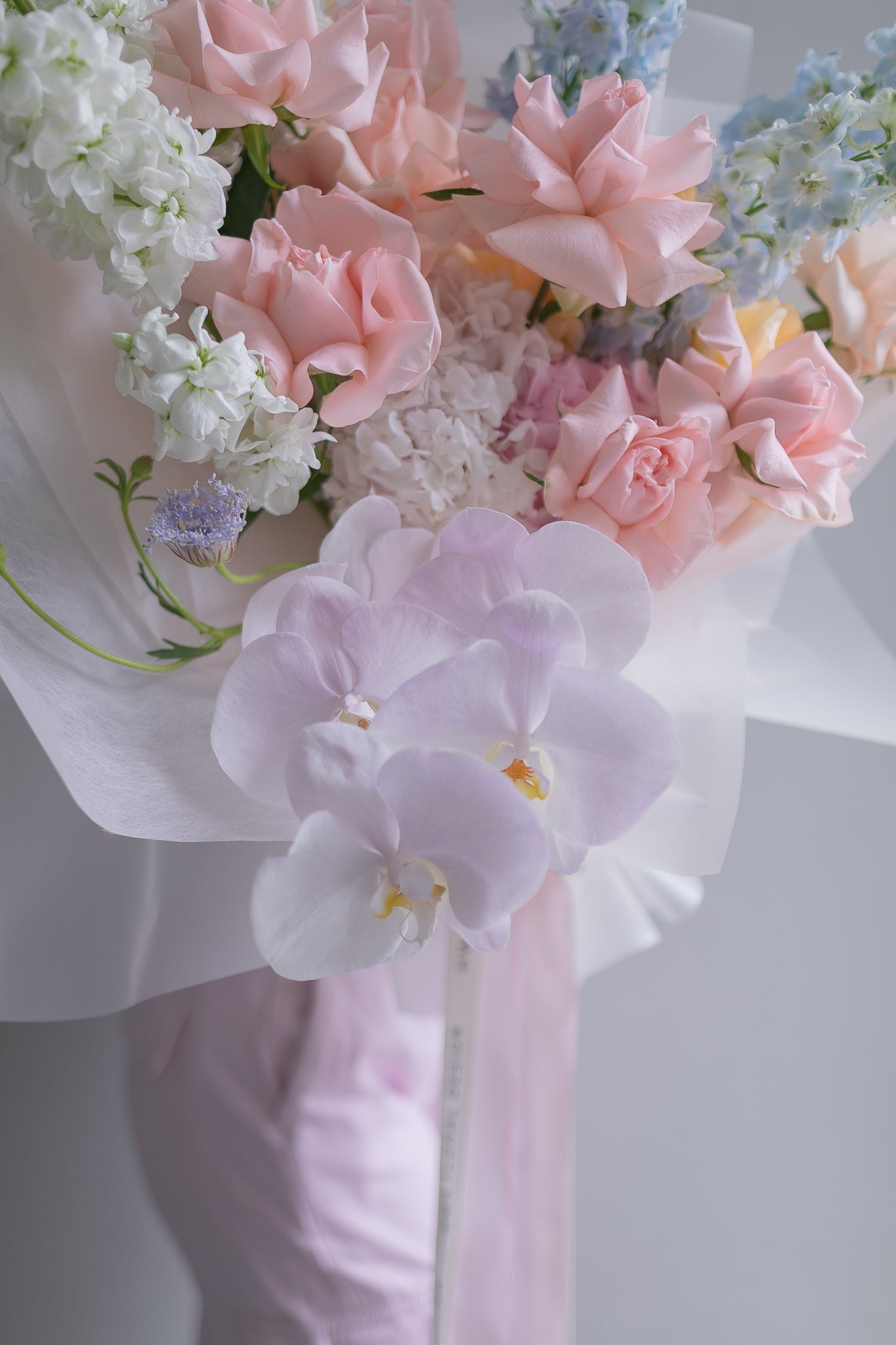 Consists of roses, delphiniums, hydrangea together with custom painted Phalaenopsis and other accent flowers.